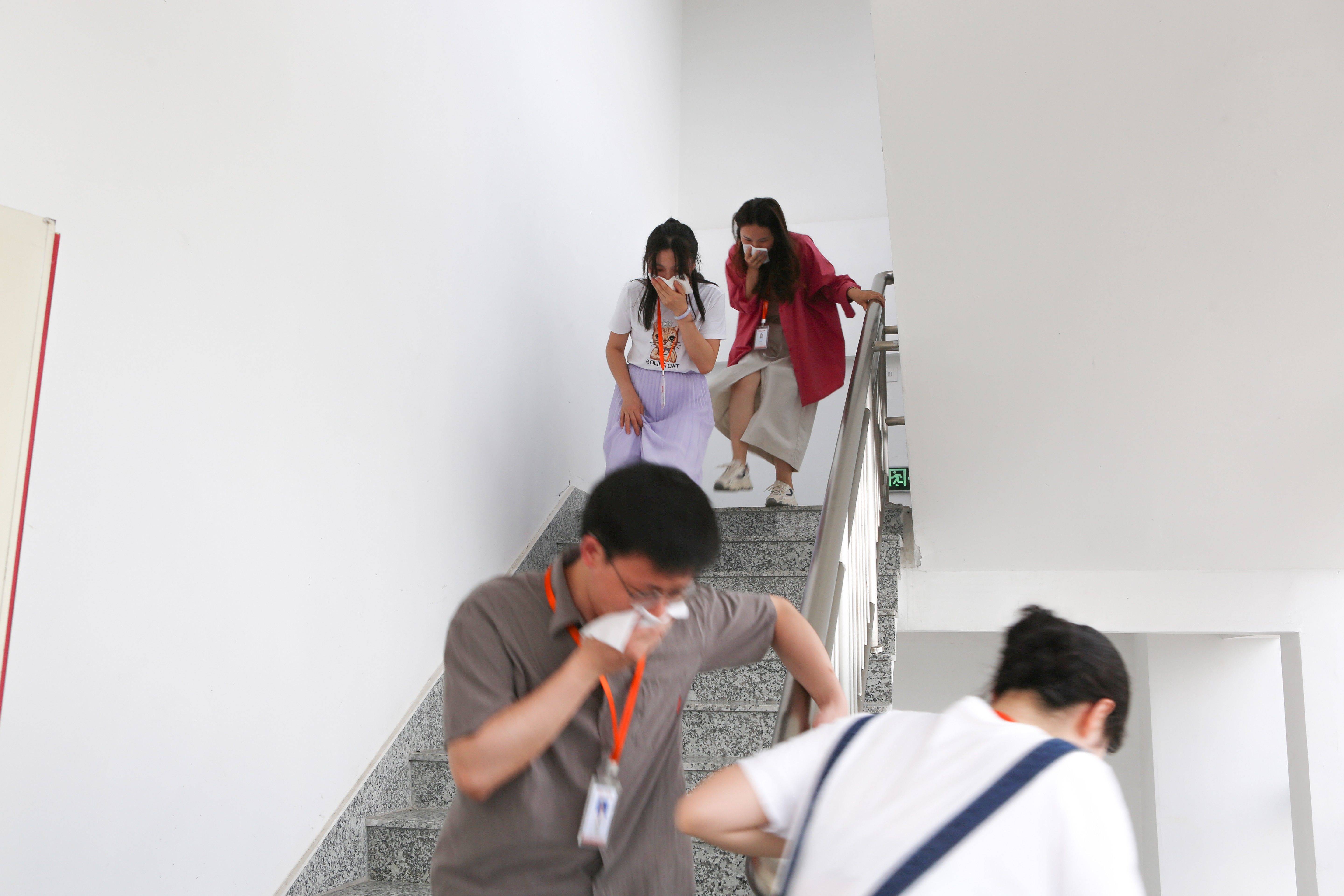At 10 a.m., the fire alarm sounded,fire control personnel went to work immediately and guided GIEC employees to evacuate quickly. GIEC employees went downstairs to the safe evacuation rally area in an urgent and orderly manner, covering their mouths and noses with wet tissues,bending forward to avoid smoke inhalation.At the simulated ignition point, the order maintenance team set up a warning line to prevent irrelevant personnel from entering.