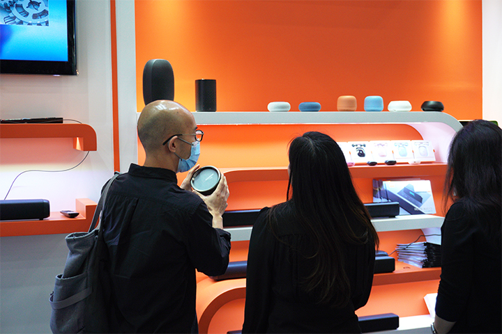 In the noisy exhibition site, GIEC Home Audio products such as AI Speaker/Soundbar with high-quality sound and highly appearance design still attracted many visitors to inquiry.