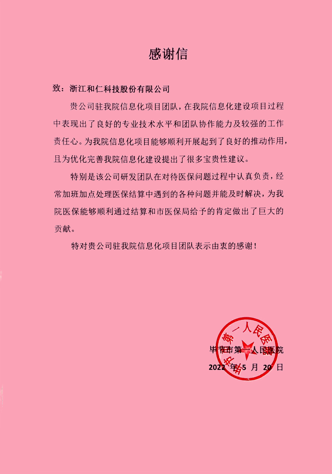 在這春意盎然、感恩勞動的五月,浙江和仁科技股份有限公司(以下簡稱“和仁科技”)收到了一封來自畢節(jié)市第一人民醫(yī)院的感謝信,字里行間充滿了對駐場團(tuán)隊良好專業(yè)技術(shù)和團(tuán)隊協(xié)作能力的認(rèn)可與贊揚(yáng),特別表揚(yáng)了和仁科技團(tuán)隊加班加點(diǎn),助力醫(yī)院醫(yī)保順利通過結(jié)算。