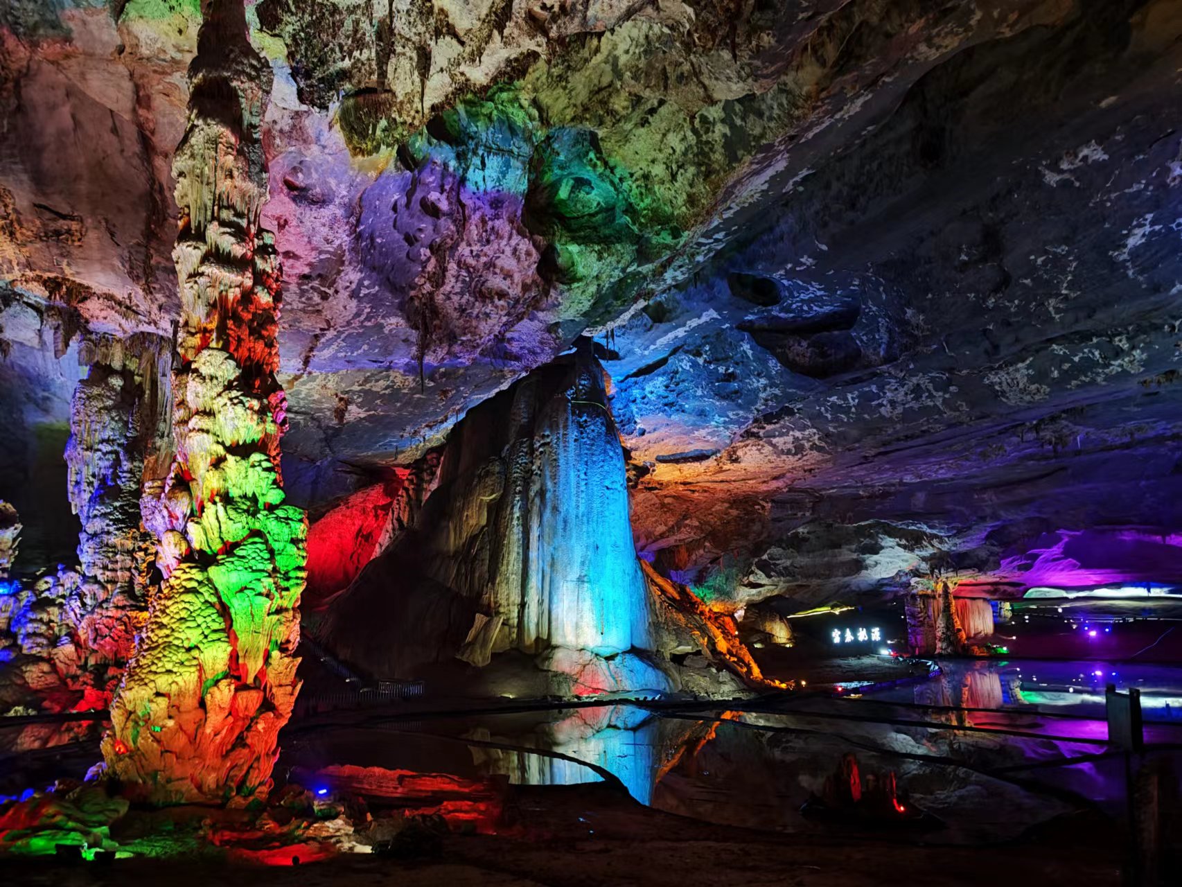中餐后我們驅(qū)車前往富春桃源,參觀了亞太地區(qū)單廳面積最大的溶洞——九霄碧云洞。洞內(nèi)面積2.8萬平方米,凈空最高處24米。這里冬暖夏涼,常溫保持在17度,我們一走進(jìn)洞內(nèi),便感到陣陣涼意。洞內(nèi)最高的鐘乳石被稱為“擎天玉柱”,其頂端一片“藍(lán)天白云”猶如被高高撐起。四周更是奇石嶙峋、千姿百態(tài),構(gòu)成23組神奇絢麗的石景,有神洲奇花,有黃果樹瀑布,有比薩斜塔,有泰國大象等等,令人目不暇接。