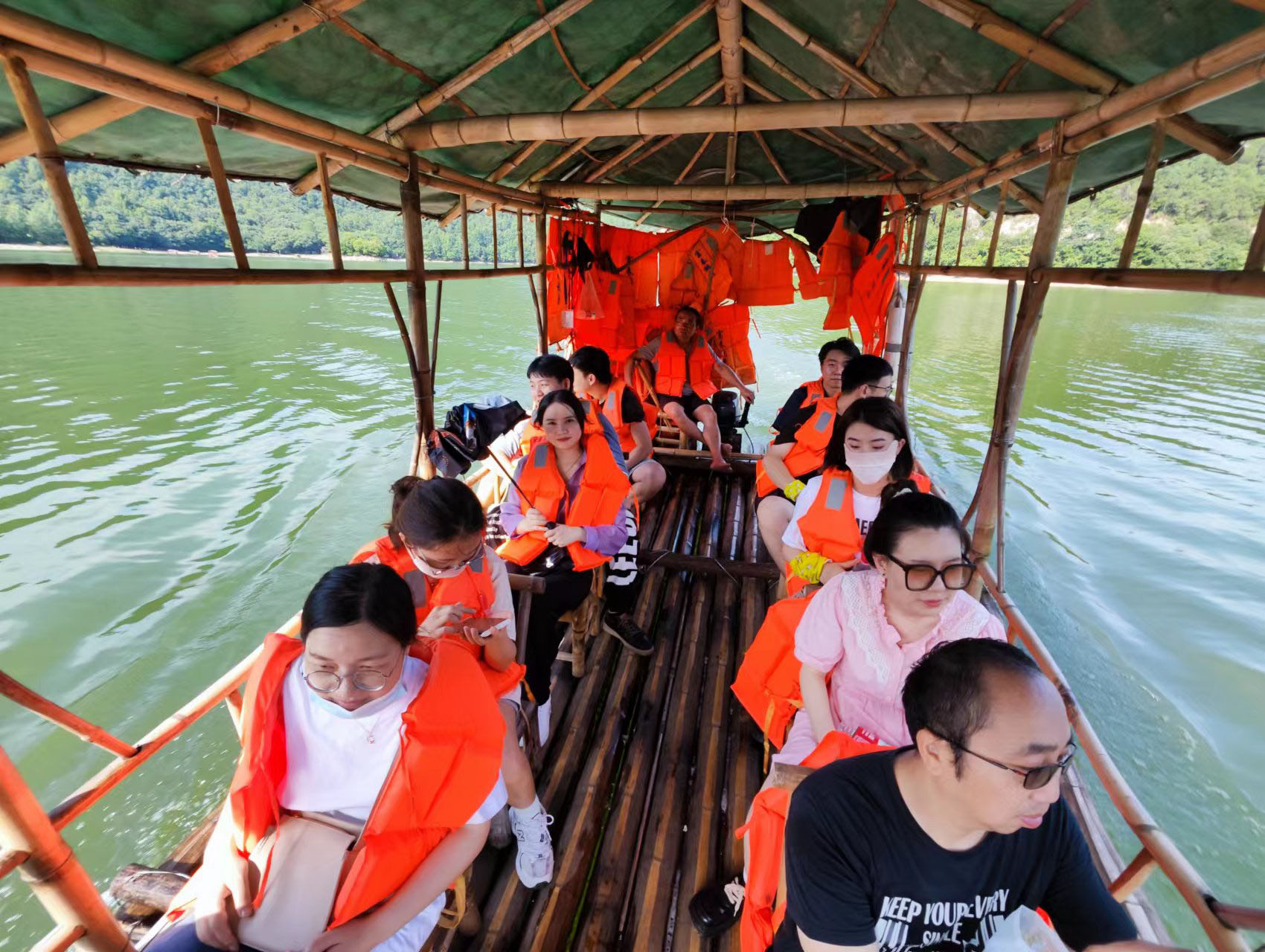 最后我們踩著滿山的綠意,一路游覽下山,坐上竹筏,在徐徐微風(fēng)中,感受著“風(fēng)軟竹筏穩(wěn),行依綠水堤”,愉快地結(jié)束了今天的愜意之行。