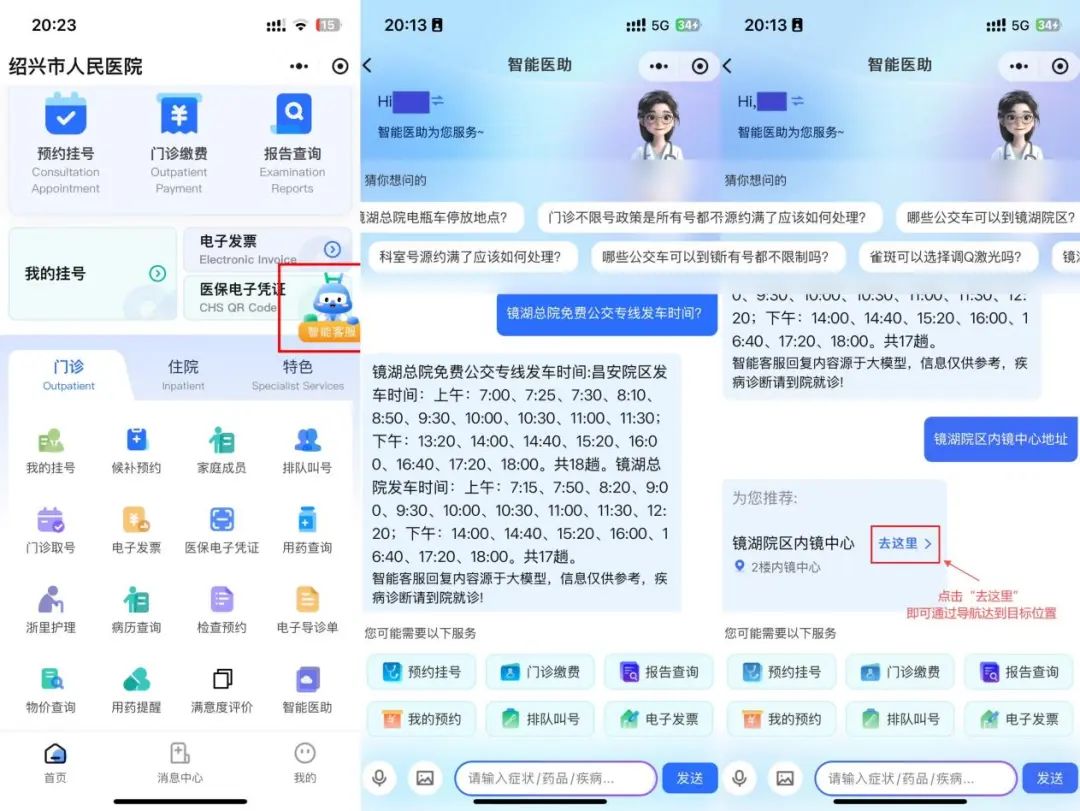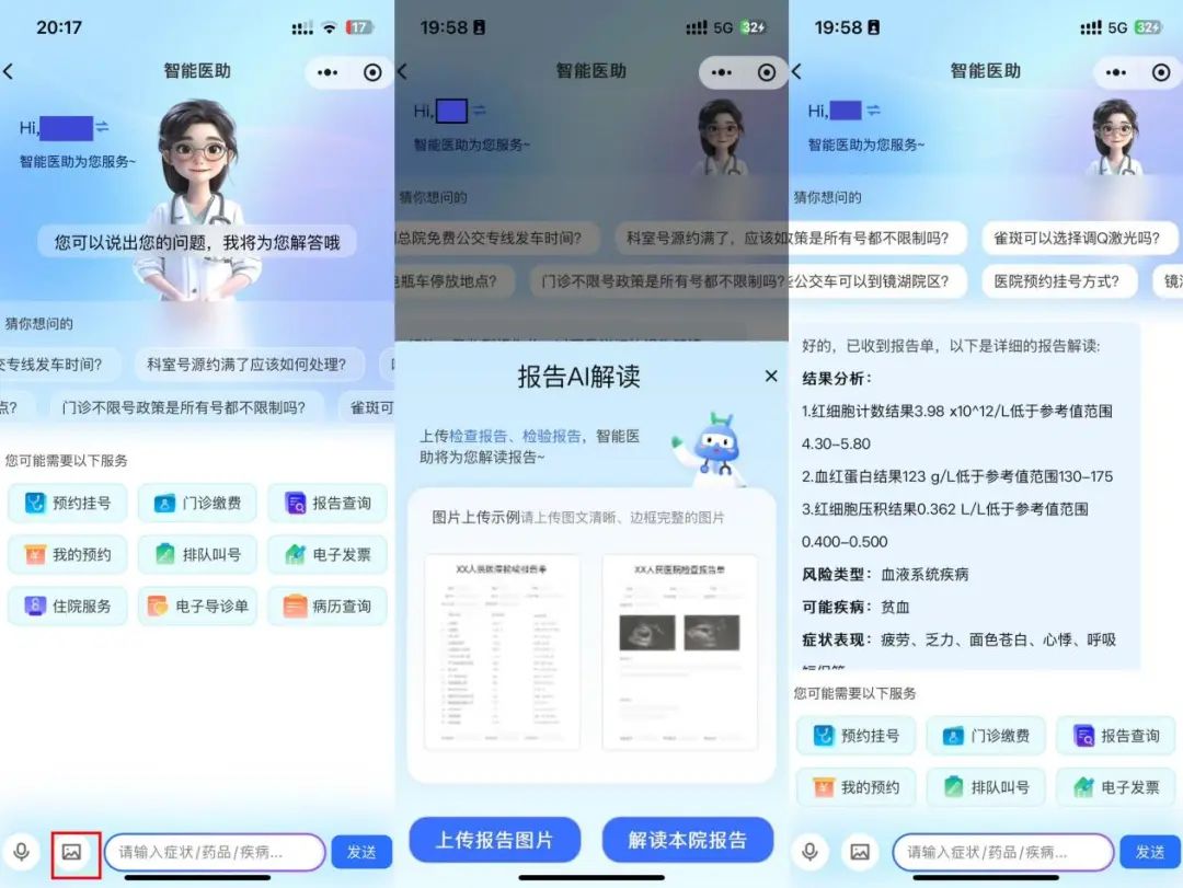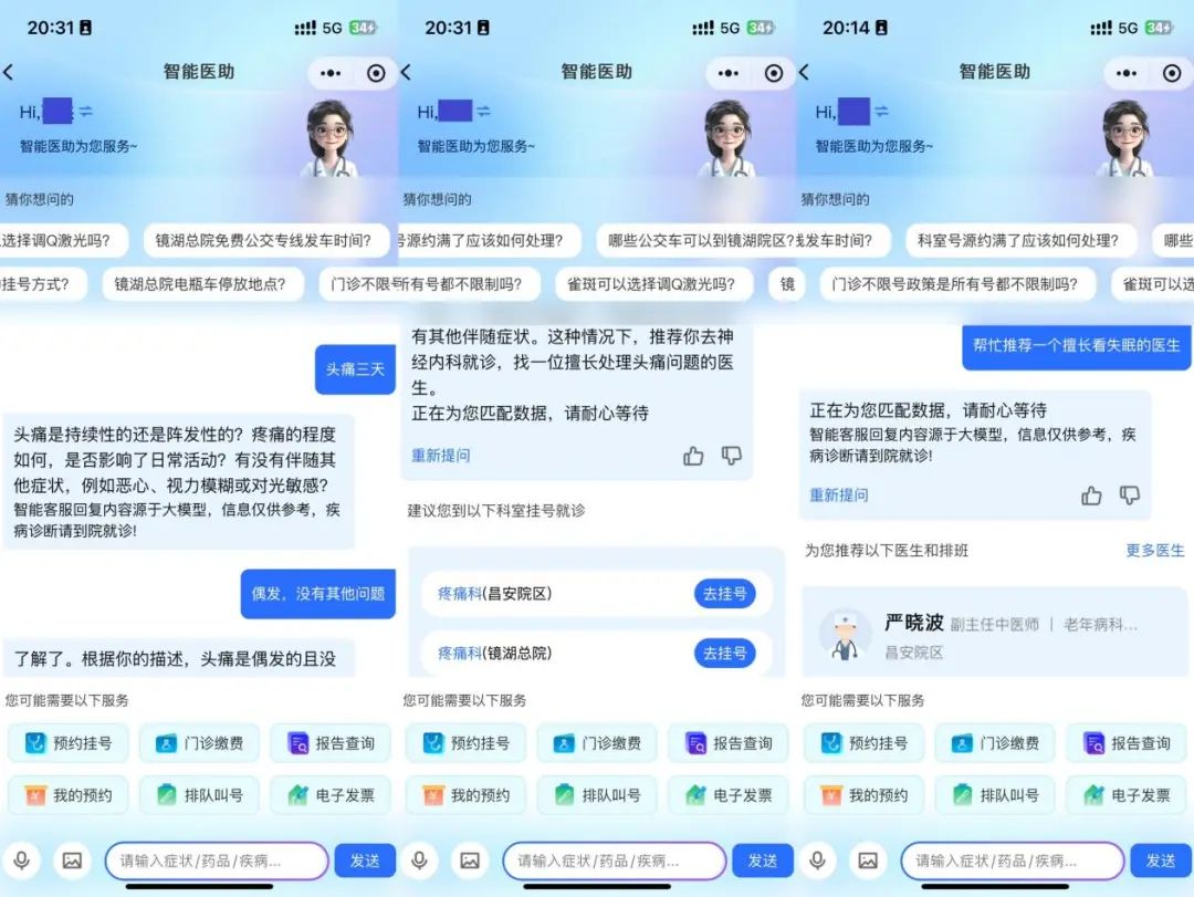 智能導診:患者通過醫(yī)院官方微信小程序描述癥狀,AI可即時分析病情并提供精準科室分診建議,有效緩解“掛號難、掛錯號”問題。