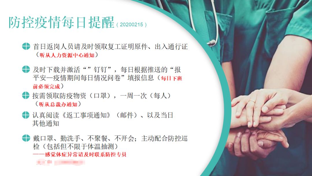 除了符合屬地政府針對(duì)復(fù)工“六到位”要求,和仁科技進(jìn)一步細(xì)化各項(xiàng)工作,例如:安排疫情防控專員,進(jìn)行防控物資統(tǒng)一分配登記、日常防控巡檢等,同時(shí)還通過(guò)公司職場(chǎng)各入口電視大屏,進(jìn)行“防控疫情每日提醒”等關(guān)鍵措施、注意事項(xiàng)提醒等。
