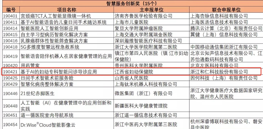11月12日,由國家衛(wèi)生健康委員會醫(yī)院管理研究所指導(dǎo)、《中國數(shù)字醫(yī)學(xué)》雜志社主辦的“2019全國醫(yī)療人工智能創(chuàng)新獎(jiǎng)”的評選活動中,由浙江和仁科技股份有限公司(以下簡稱“和仁科技”)和江西省婦幼保健院聯(lián)合申報(bào)的“基于AI的婦幼專科智能問診導(dǎo)診應(yīng)用”榮獲智慧服務(wù)創(chuàng)新獎(jiǎng)。