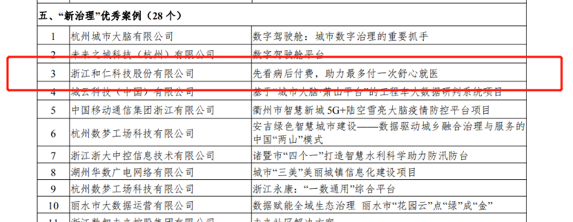 2020年11月,由浙江省經(jīng)信廳組織的浙江省數(shù)字經(jīng)信“五新”優(yōu)秀案例評選活動,經(jīng)省廳初審、專家評審等層層評比,和仁科技申報(bào)的“先看病后付費(fèi),助力最多付一次舒心就醫(yī)”方案成功入選年度“新治理”優(yōu)秀案例。
